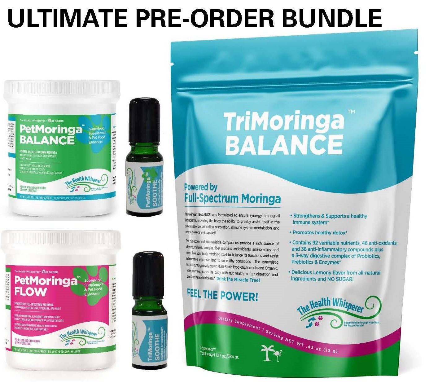 BEST PRE-ORDER DEAL: PRE-ORDER ULTIMATE BUNDLE: Buy 1 TriMoringa™ BALANCE + 2 PetMoringa™ FLOW + 1 PetMoringa™ SOOTHE + 1 TriMoringa™ SOOTHE, all at 10% off, Get 1 PetMoringa™ BALANCE FREE and save a total of $76.80!